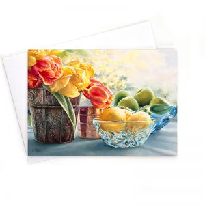Last Tulips captures a moment of beauty, light, and reflection that will inevitably pass as the sun shifts, flowers wilt, and objects are forgotten. For me, this painting evokes thoughts of remembrance and the passage of time. Here, the last tulips of the season glow with the surrounding antiques, caught in a fleeting moment of contemplation. Reflections through the glass create swirls that seem to embrace the surrounding objects, connecting them together in memory.
